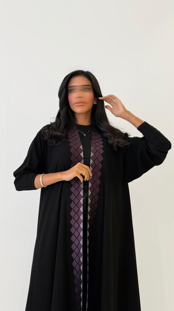 عباية خزامى بقصة نص كلوش بتطريز من الامام باللون الموف والرمادي الغامق